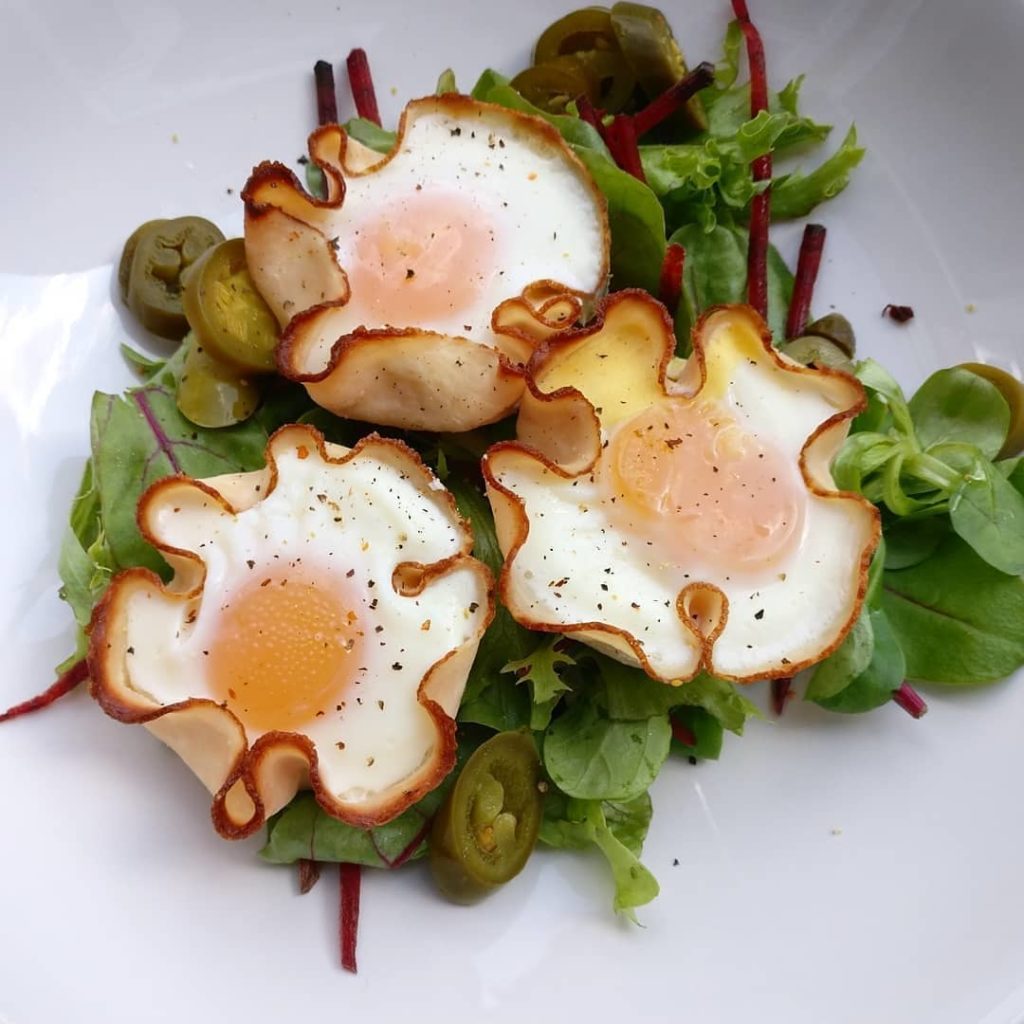 Pop them in a pre heated oven for about 15 minutes or longer if you prefer a fully cooked yolk. Once cooked season with salt and pepper.